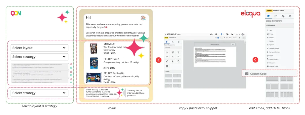 The seamless integration between Oracle Eloqua and Quarticon (AI-mails) empowers marketers to utilize the full functionality of Oracle Eloqua in conjunction with the AI-driven capabilities of serving product cards / product recommendations in e-mails. This allows for the agentic segmentation of customer data, and the delivery of targeted campaigns that bases on customer behavior and preferences.